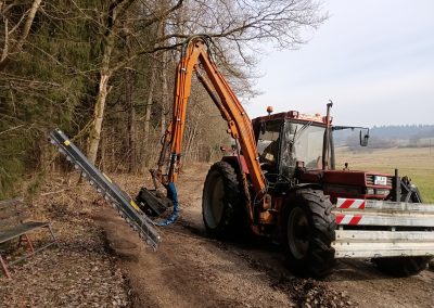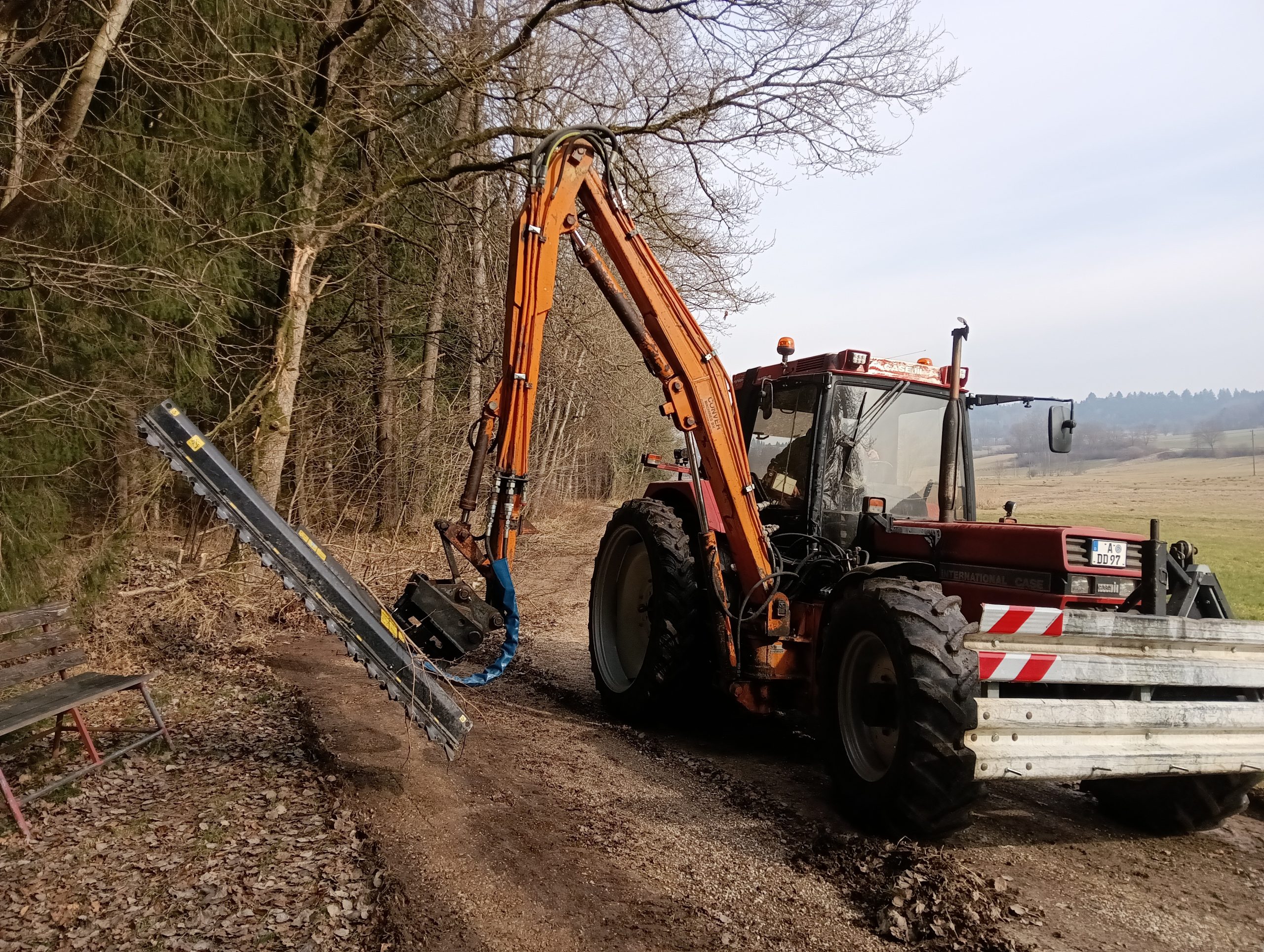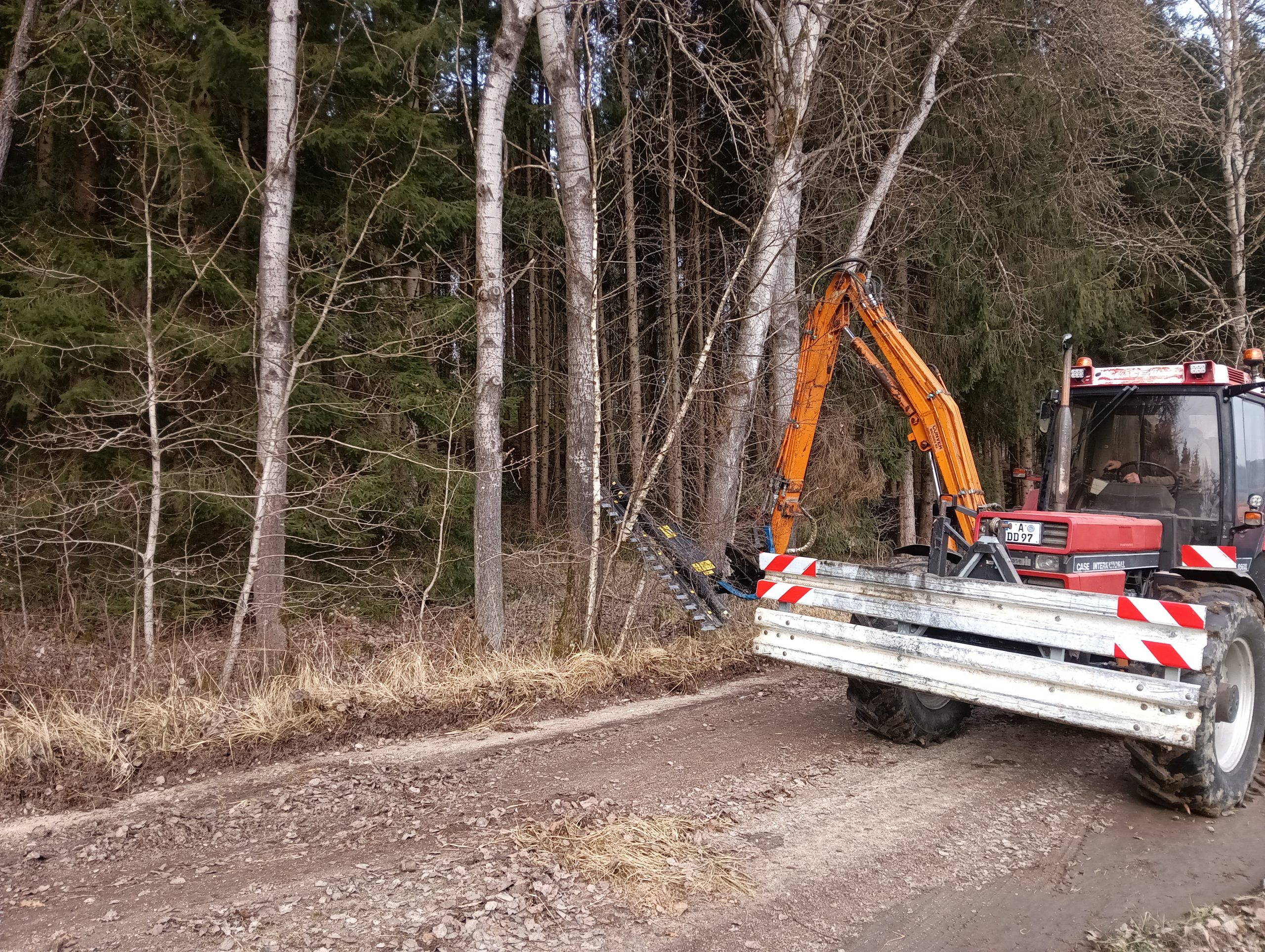 Zur Wegepflege gehört auch der regelmäßige Lichtraumprofilschnitt, also das Freischneiden des Wegeraums von überhängenden Ästen, Sträuchern und Bewuchs. Er sorgt dafür, dass Wege und Zufahrten im Wald, auf Wiesen oder entlang von Feldrainen sicher befahrbar und begehbar bleiben.